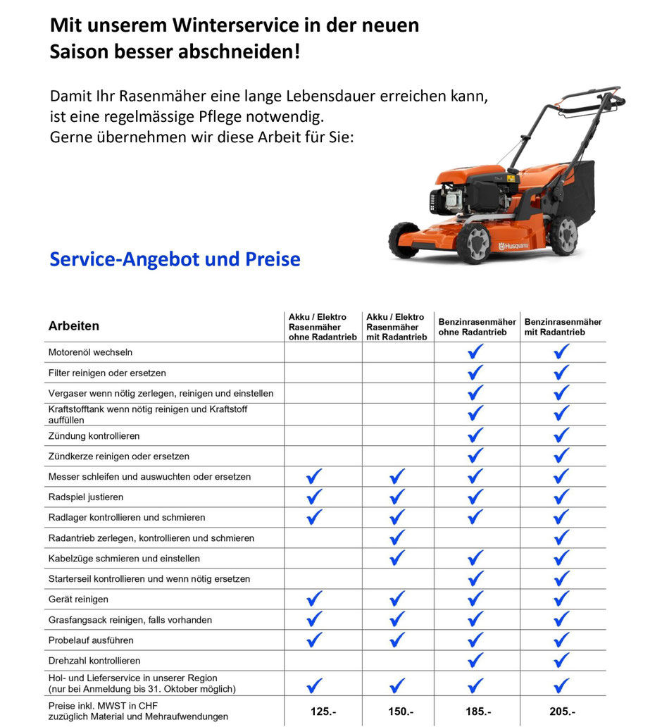 Wir bieten zum Winterservice eine kostenlose Abholung und Lieferung in unserer Region an.